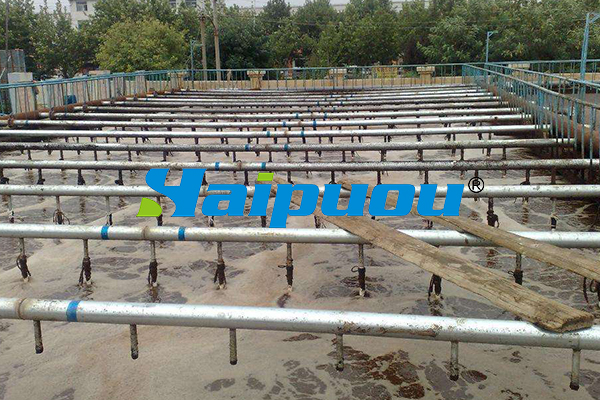 污水和回流的活性污泥一起進入曝氣池形成混合液。從空氣壓縮機站送來的壓縮空氣,通過鋪設在曝氣池底部的空氣擴散裝置,以細小氣泡的形式進入污水中,目的是增加污水中的溶解氧含量,還使混合液處于劇烈攪動的狀態(tài),呈懸浮狀態(tài)。溶解氧、活性污泥與污水互相混合、充分接觸,使活性污泥反應得以正常進行。