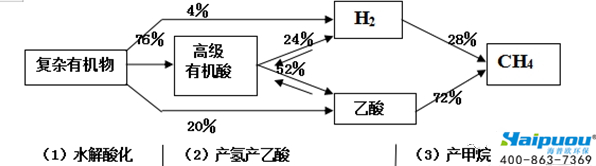 ⑵制氫和醋酸生產(chǎn)階段。在產(chǎn)氫產(chǎn)酸細(xì)菌的作用下,各種有機(jī)酸分解轉(zhuǎn)化為乙酸、氫氣和二氧化碳。