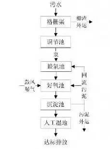 處理規(guī)模不低于200噸/天。工藝參數(shù):厭氧池停留時(shí)間不小于2h,缺氧池不小于4h,好氧池不小于6h,人工濕地水力負(fù)荷為0.5~1.0m3/(m2·d),污泥處理周期為180天。