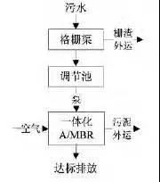 該技術(shù)適用于有回用要求或用地緊張的污水處理設(shè)施,處理規(guī)模為20~500噸/天。工藝參數(shù):缺氧反應(yīng)區(qū)停留時(shí)間不小于2h,MBR區(qū)停留時(shí)間不小于4h,污泥處理周期為360天。工藝流程見圖如下: